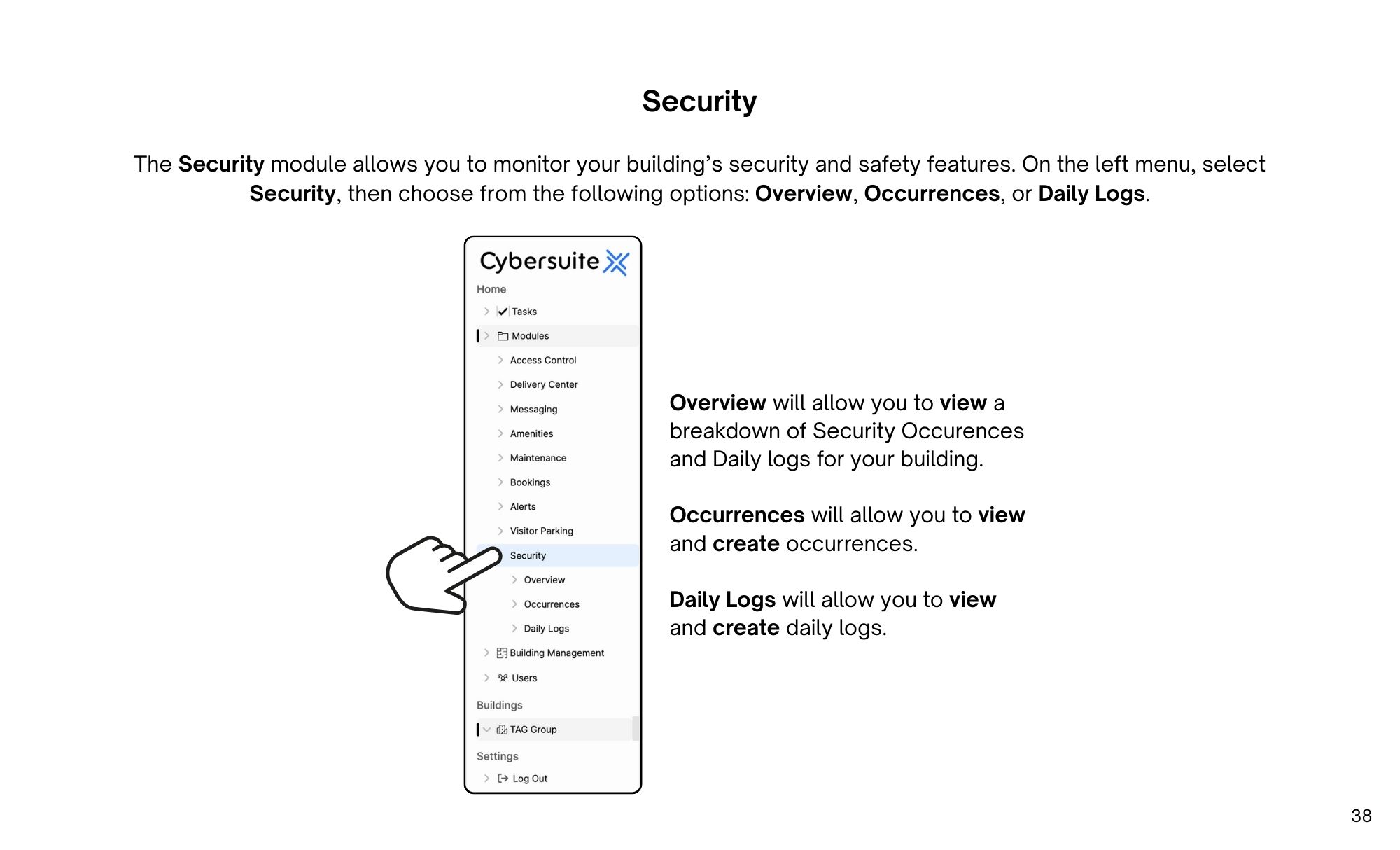 The Security module allows you to actively monitor and manage your building’s security and safety features, providing a centralized space for tracking incidents, reviewing daily activity, and maintaining detailed security records.