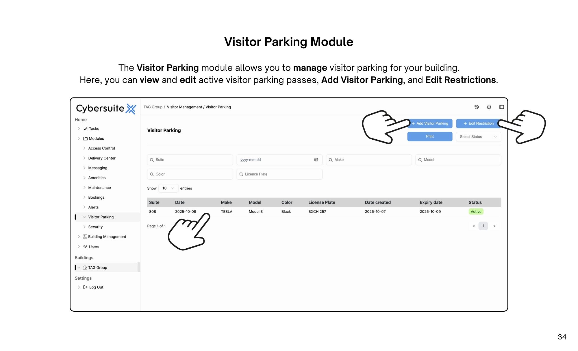 The Visitor Parking module allows you to manage visitor parking for your building.